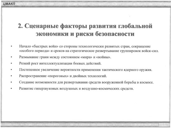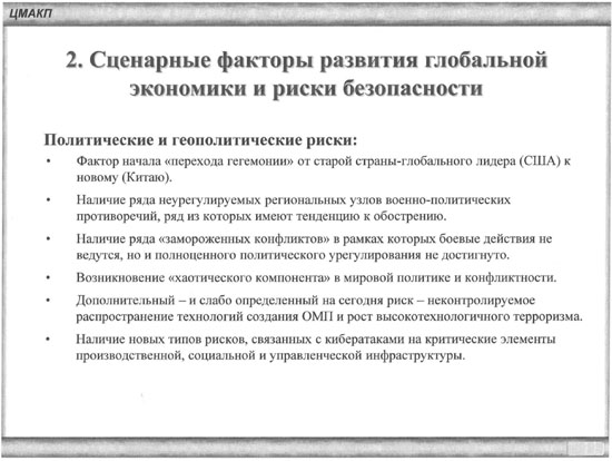 Порядок формирования сценариев и вариантов развития человеческой цивилизации[3] (ЧЦ), международной обстановки (МО) и военно-политической обстановки (ВПО) в мире сегодня определяется исследователями сугубо в зависимости от их профессиональной ориентации и идеологической приверженности, а иногда и вкуса. Только в тех случаях, когда этот процесс поручается координировать межведомственным группам (как Комитету по делам разведки США, например) к работе на системной основе привлекаются разные специалисты, а субъективные факторы уступают место системным усилиям. Таких системных попыток стратегического прогнозирования различных сценариев развития человечества, экономики, науки и техники и других областей человеческой деятельности к настоящему времени существует немало.