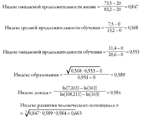 Первый этап состоит в том, чтобы создать подындексы для каждого измерения. Чтобы преобразовать показатели в индексы со шкалой от 0 до 1. необходимо установить минимальные и максимальные значения (или целевые ориентиры). Поскольку для агрегирования используется среднее геометрическое, максимальное значение не влияет на сравнение (в процентах) между любыми двумя странами или периодами времени. Максимальные значения присваиваются фактически наблюдаемым высшим значениям страновых индикаторов во временном ряду, т.е. за период 1980-2010 гг. На сравнение будут влиять минимальные значения, поэтому используются величины, надлежащим образом задуманные как прожиточный минимум или "естественный" нуль. Таким образом, прогресс измеряется по сравнению с минимальными уровнями, которые необходимы обществу для выживания в течение определенного времени. Установлены следующие минимальные значения: для ожидаемой продолжительности жизни при рождении - 20 лет, для обеих переменных в сфере образования - 0 лет и для ВНД на душу населения - 163 долл. США. Минимальное значение ожидаемой продолжительности жизни основано на долговременных исторических данных, заимствованных из работ Maddison (2010) и Riley (2005)1. Представление о минимальном уровне образования оправдано тем, что общества могут существовать без формального образования. Базовый уровень дохода, необходимый для выживания и составляющий 163 долл. США, - это наименьшее значение, достигнутое какой-либо страной по имеющимся историческим данным (Зимбабве, 2008 г.), эквивалентное 45 центам в день, что несколько превышает 1/3 установленной Всемирным банком черты бедности в 1,25 долл. США в день.