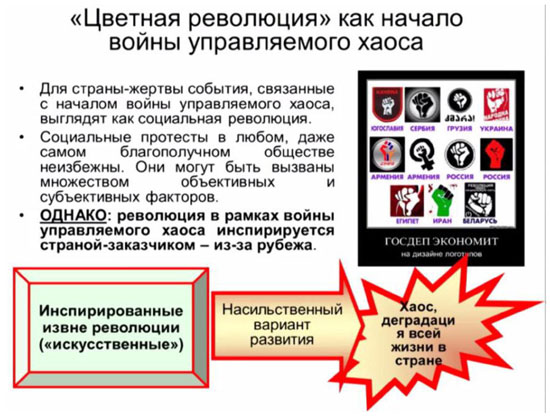 Особое значение приобретает та часть сетецентрической стратегии, которая направлена на внутриполитическую дестабилизацию стран-противников, создание в них предпосылок и условий для искусственного провоцирования социальных конфликтов и гражданских войн. Эта часть специальных операций выходит в военной стратегии на первый, приоритетный план, вытесняя действия собственно вооруженных сил. Конечной целью является провоцирование хаоса, в котором слабеющие позиции США будут сохранять доминирование.