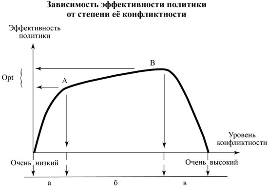 Сам по себе конфликт, как острый способ разрешения противоречий, далеко не всегда вреден. По аналогии со стрессом, если конфликт не приобретает затяжную и крайнюю форму (в случае межгосударственных конфликтов, - форму силового противоборства) он может быть даже полезен, так как иногда является средством ускорения решения какой-то проблемы или противоречия. Как показано на одном из графиков, опасными становятся как очень низкие, так и очень высокие степени конфликтов.
