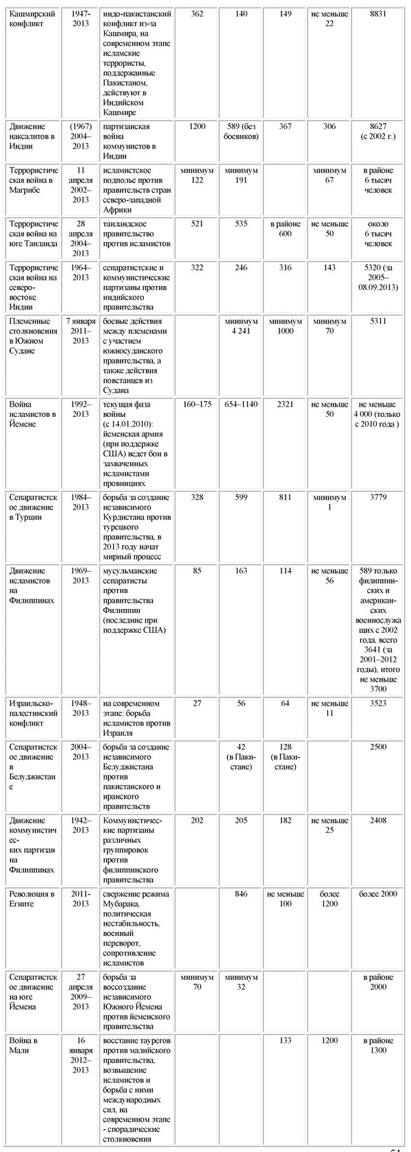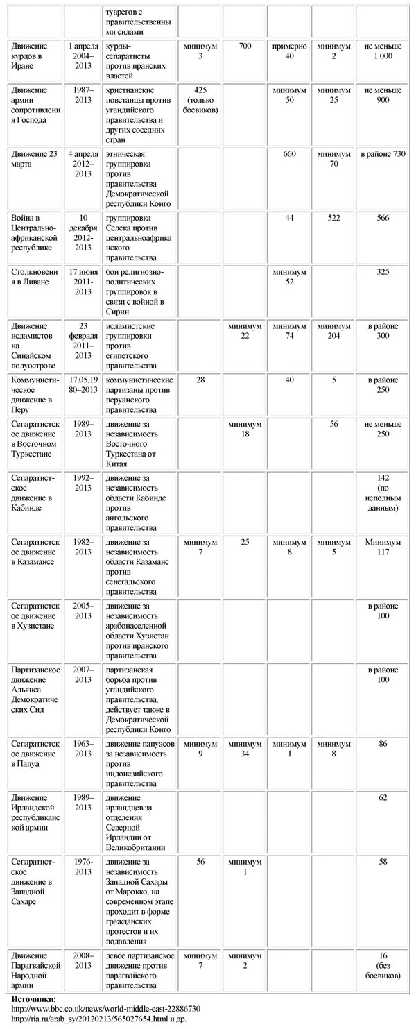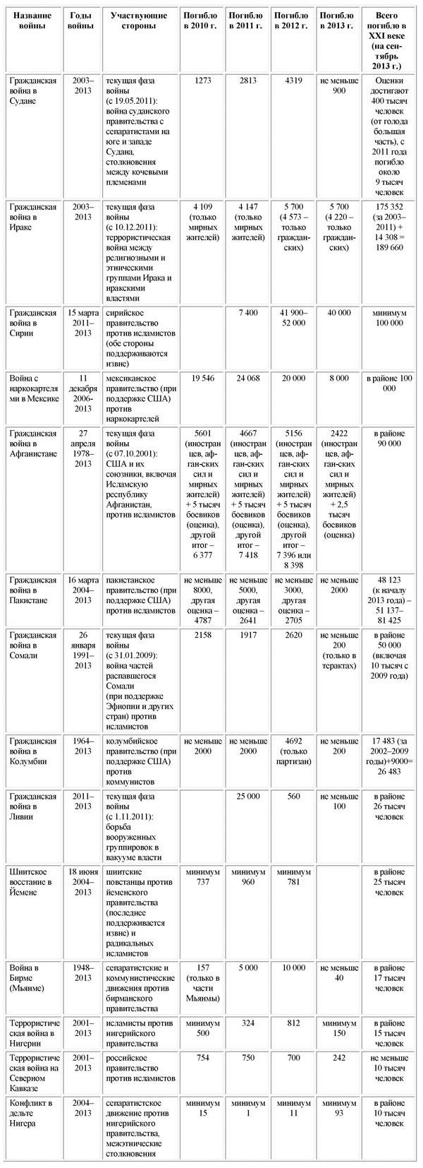 Так, к концу 2013 года в 30 странах мира продолжались более полусотни конфликтов и войн (в ряде стран идет сразу несколько войн), не менее десяти из них можно охарактеризовать как гражданские войны, еще десять войн - террористические, два десятка конфликтов идет за отделение территорий (сепаратистские). Идеологически 12 войн ведут исламисты, 7 - коммунисты. По 15 конфликтов идет на Ближнем Востоке и в Африке. Число погибших в этих войнах с начала XXI века достигло 1 миллион 200 тыс. человек[31].