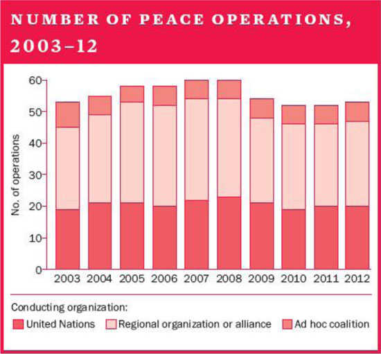Как видно из диаграммы, приводимой ниже, количество миротворческих акций не снижается и вряд ли можно говорить о том, что в ближнесрочной и среднесрочной перспективе их будет меньше. Данные, скорее, свидетельствуют о том, что произошла некая стабилизация ежегодной численности военных конфликтов в мире в XXI веке на уровне 50 единиц, характерная для данного числа участников ВПО и ограниченного пространства, численности коалиций и др. параметров, характеризующих современную СО.