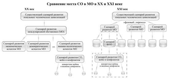 Вместе с тем конкретное содержание тех или иных сценариев СО на таком удалении прогнозировать невозможно: конкретные политические, социальные, природные, финансовые, этические и т.д. условия могут и будут стремительно меняться, как и конкретная ВПО, расстановка сил в мире и другие факторы. Для их прогноза требуются более сложные системные модели, которые, надо сказать, отчасти уже нашли свое применение. Содержание будущих сценариев развития СО труднее прогнозировать и потому, что они во все меньшей степени будут зависеть от содержания ВПО и во все большей от отношений между локальными цивилизациями и невоенных трендов в развитии человечества.
