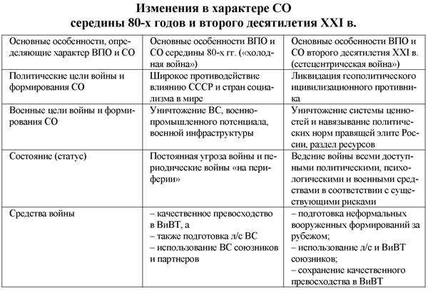При сохранении логики развития сценариев СО надо иметь в виду в то же время уже состоявшееся изменение в стратегии борьбы которая переформатировалась из "холодной войны" в сетецентрическую войну. Во втором десятилетии XXI века эта трансформация означала изменение всех основных особенностей в характере современной СО по сравнению, например, со СО середина 80-х годов. Можно коротко обозначить эти изменения следующим образом.