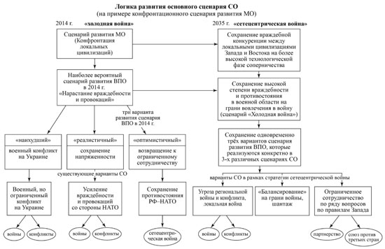 Как видно из рисунка, СО стабильно эволюционизирует в направлении активизации сетецентрической войны. Все три вероятные сценария эволюции развития ВПО в СО находятся в рамках сетецнтрической войны. Это означает, что в настоящее время у Запада не существует в принципе сценариев развития МО, ВПО в рамках какого-либо равноправного сотрудничества. По сути дела им жестко формулируется политическая альтернатива: либо Россия и другие страны должны принять нормы и правила, сформулированные Западом на основе их системы ценностей и понимания интересов, предполагая, что правящие элиты других стран должны приспособиться к этим требованиям, либо им будет навязано это же поведение и понимание с помощью силы, включая военной силы, используя для этого механизмы сетецентрической войны.
