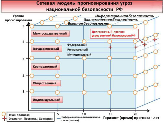 В этих условиях приобретает особое значение долгосрочное прогнозирование сценариев развития СО и внешних угроз России, которое неизбежно должно основываться на прогнозе угроз развития ЧЦ, МО, ВПО и, как следствие, собственно СО[6]. На рисунке ниже демонстрируется одна из таких системных моделей, где цивилизационный уровень заменен на межгосударственный, а национальный - на информационную и экономическую безопасность. Не вдаваясь в детали, важно отметить, что такие модели стратегического прогноза учитывают главное - системность и иерархичность в развитии военных сценариев от цивилизационных.