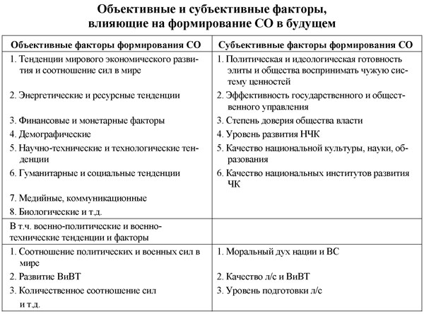 Таким образом, анализируя и прогнозируя будущие конкретные сценарии развития СО, мы должны четко выделить две категории факторов: во-первых, долговременные объективные тенденции и факторы формирующие ВПО, с одной стороны, и во-вторых, уникальные, конкретно-исторические, социальные, военные и иные, - с другой, разделив их для удобства в матрице на две группы. Это необходимо, для того, чтобы четче понять объективные условия формирования сценария сетецентрической войны.