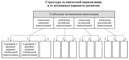Как видно из рисунка, возможны, как минимум, но три сценария развития каждой локальной цивилизации в сочетании с глобальной цивилизацией. Разница между ними будет заключаться прежде всего в приоритете национальных систем ценностей и интересов (локальных цивилизаций) по отношению к глобальной и другим локальным цивилизациям. Итого, как минимум (4х3), 12 локально-глобальных сценариев и 1 сценарий абсолютного доминирования глобальной цивилизации.