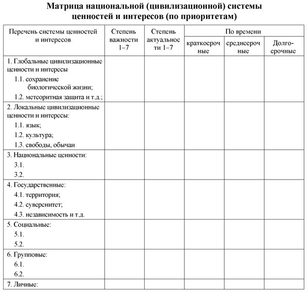 Национальная (цивилизационная) система ценностей и интересов представляет в реальности сложное сочетание самых разных по своей роли и значению ценностей и интересов, которые можно в упрощенном виде представить в виде следующей матрицы.