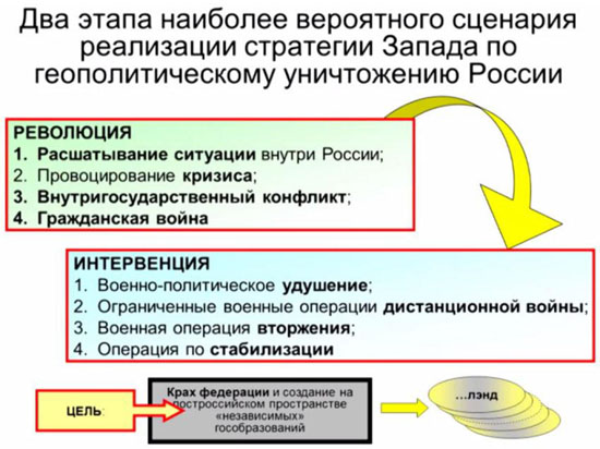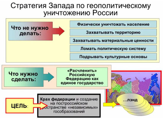 Представляется, что главная и конечная цель западной локальной цивилизации иная: раздел РФ на отдельные самостоятельные (даже суверенные) регионы является неизбежной, но промежуточной целью. Только разделенная Россия, также как до этого СССР, а перед этим ОВД, может согласиться на следующие условия сосуществования с Западом, которые во втором десятилетии XXI века просматриваются очень точно: