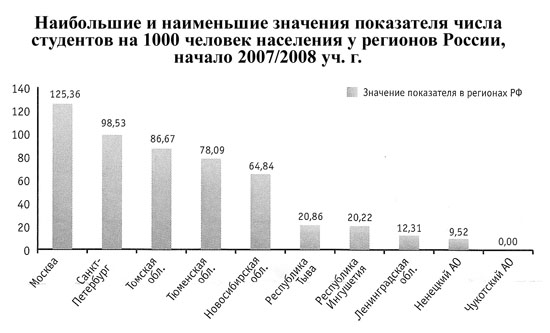 Конечно же были и позитивные моменты в этот период развития страны, но они не объясняются управляющим воздействием элиты, скорее, действовали вопреки. Нельзя, например, игнорировать тот факт, что в самой запущенной сфере - информационных технологий - РАН готов закончить суперкомпьютер, производительностью в тысячу триллионов операций, для которого создали самые экономичные алгоритмы[6]. Но подобные примеры являются скорее исключением, чем положительной тенденцией. Общее отношение к образованию в 2007-2011 годы, безусловно, сказалось и на его качестве, и на информатизации в целом. Тем более, что между ними обнаружилась прямая зависимость. Как признают эксперты ИНСОР, исследования показали, что уровень развития ИКТ в значительной степени коррелирует с численностью студентов. В силу сложившейся образовательной инфраструктуры и особого статуса Москва и Санкт-Петербург служат центрами притяжения студентов из других субъектов РФ. В Санкт-Петербурге на 1000 жителей приходится 98,5 студента, в то время как Ленинградская область по числу студентов занимает 81-е место, опережая лишь Ненецкий и Чукотский АО. В итоге, несмотря на достаточно высокую численность исследователей в составе рабочей силы (26-я строка в рейтинге субъектов РФ), Ленинградская область оказалась на одном из последних мест по уровню развития человеческого капитал"[7].