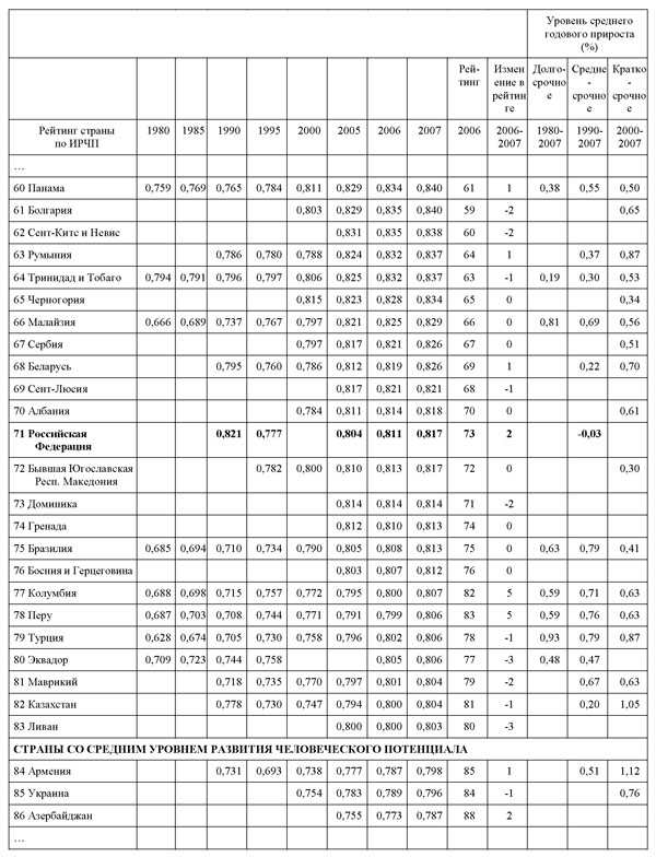 Позже, после 2007 года, среднесрочный прирост стал немного положительным, что позволило России подняться с 73-го места в 2007 году до 65-го - в 2010. Но вызвано это было не реальным ростом, а преодолением того обвала, который произошел в 90-е годы. В целом же долгосрочная тенденция за 20 лет означает стагнацию. Что выражается как в отсутствии роста ИРЧП, так и сохранением за Россией места в своей группе стран, которые по всем показателям относят не к развитым, а развивающимся государствам.