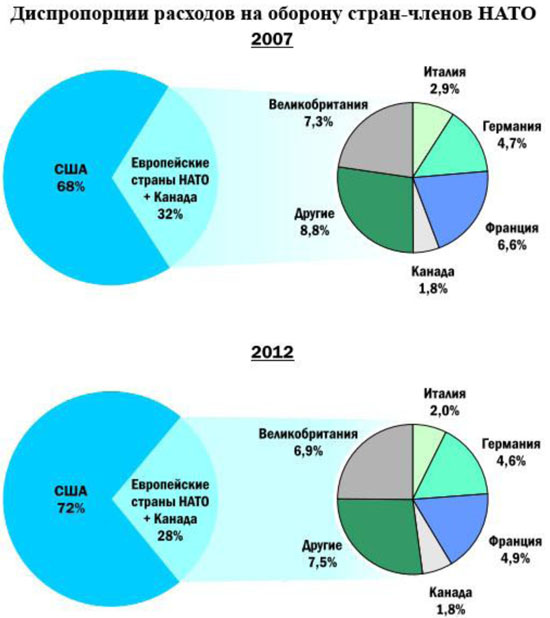 Если говорить о Европе, то этот процесс объясняется относительным игнорированием со стороны некоторых стран-членов НАТО общих потребностей блока в последние годы. Это хорошо видно на примере изменения относительной доли ведущих стран НАТО в общих объемах военных расходов.