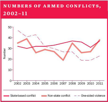 Более того, если судить о характере военной активности участников ВПО в начале XXI века, то эти тенденции полностью подтверждаются. В частности, если в 2002 году численность односторонних акций существенно (на 40%) превышала численность международных конфликтов, то в 2012 году, наоборот. Увеличилось и количество акций, предпринимаемых негосударственными акторами (как правило, по инициативе враждебных государств). Это хорошо видно из статистики, подготовленной СИПРИ.