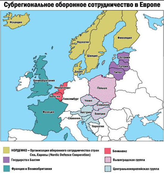 "Исправление" этой ситуации предполагается в рамках развития сценария военно-политической консолидации, когда на разных уровнях и в разной степени зависимости от США создается система военно-политических отношений, подконтрольная именно США. Одним из таких примеров может стать политика субрегионального военного сотрудничества в Европе.