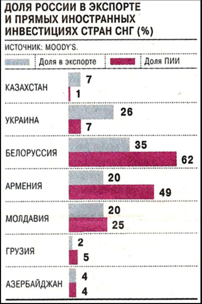 Соответственно надо признать, что без политической и военной интеграции евразийских государств (не вошедших в НАТО или систему военных союзов, создаваемых США), обеспеченной сознательной информационной и культурно-образовательной (идеологической) политикой, обеспечение безопасности в Евразии и проект евразийской интеграции превратится в простое соглашение о торговле. Тем более, что масштабы экономической интеграции в Евразии не являются такими уж впечатляющими. Они очевидно не смогут предопределить геополитическое будущее Евразии сами по себе. Тем более, они не смогут автоматически превратить Россию в центр евразийской интеграции - "российское ядро" всего интеграционного процесса, что хорошо видно из следующих данных.