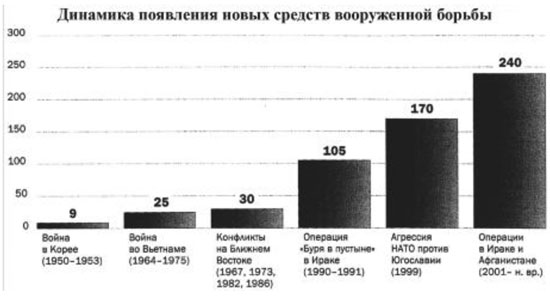 Ложные рассуждения о "недопустимости войны", ее "невозможности", "аморальности" и "бесчеловечности" не имеют ничего общего с реальной политикой. Политические декларации имеют некоторый смысл лишь до определенной степени. В действительности мы наблюдаем стремительное и бесконтрольное развитие ВВТ по всем направлениям, которые достаточно четко определяются военно-политическим руководством ведущих государств. Что видно из простого подсчета появления новых систем оружия, проведенного экспертами[3].