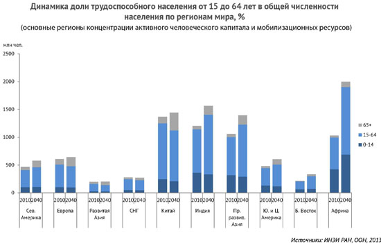 Любая система безопасности - мировая, региональная, национальная - имеет прежде всего пространственно-геополитическое измерение. Даже расширение воздушно-космического пространства до глобального ТВД не отменяет этой характеристики потому, что конечные объекты безопасности и субъекты ВПО расположены на поверхности земли и воды. Так, оценивая демографические ресурсы (и, кстати, также мобилизационные ресурсы планеты во втором десятилетии XXI века и через 30 лет, мы видим что количественно и, главное, качественно к 2040 году они будут составлять большинство населения мира и соответственно самые массовые вооруженные силы.