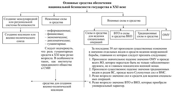 Отдельно следует сказать о появлении и стремительно растущем значении высокоточного оружия и средств воздушно-космической обороны (ВТО и ВКО), которые должны обеспечить "силовой фон" для применения силовых и вооруженных невоенных акций. Без гарантированного "прикрытия" с воздуха применение любых силовых средств - как вооруженных, так и гражданских - бессмысленно. Эти же средства нападения и обороны способны гарантировать достижения политических целей конфликта на стадиях, когда они еще не переходят в масштабные вооруженные операции. Таким образом в XXI веке способность обеспечения национальной безопасности и суверенитета государств зависит от двух основных силовых групп: невоенных и собственно военных, среди которых выделяются отдельные способы и средства, которые можно изобразить на следующей логической схеме.