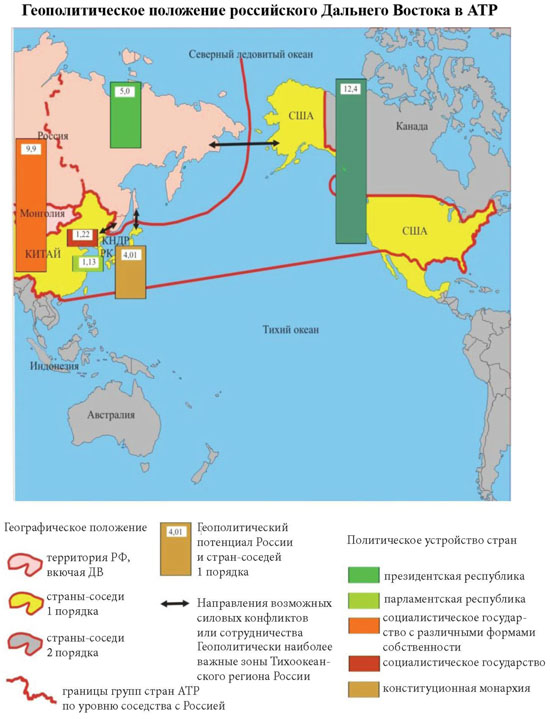 Как видно из рисунка, геополитические противоречия между Россией и США по мере развития и усиления АТР будут усиливаться, делая превращение союза США и России из потенциально возможного в вероятный все менее реальным.