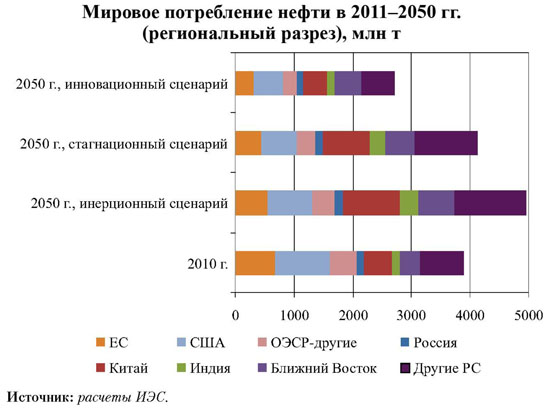 В принципе с такими оценками согласны и авторы глобального энергетического прогноза, которые признают, что "Мировое потребление нефти до 2030 г. будет расти в инерционном (20%), и стагнационном (15 %) сценарии при снижении в инновационном сценарии на 5%. После 2030 г. в инерционном сценарии рост продолжается (на 9% к 2050 г.). В стагнационном и инновационном сценариях он сменяется спадом (на 6 и 25% соответственно).