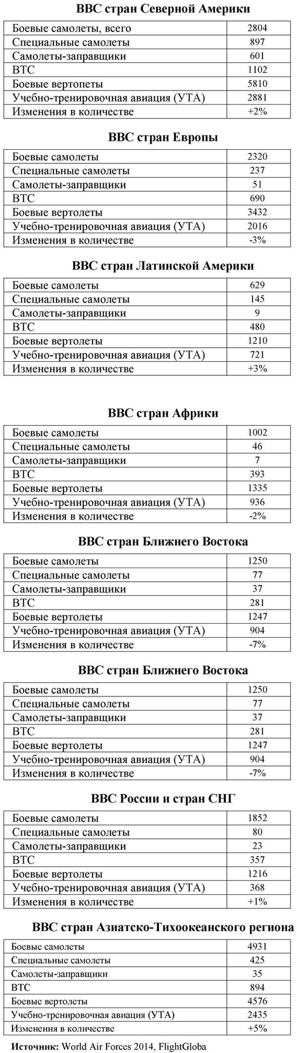 Очевидно, что "ядром" такой коалиции может быть только Россия, обладающая необходимым научно-техническим и экономическим потенциалом. Теоретически на эту роль мог бы претендовать Китай, однако вряд ли он будет готов быть только лидером такой коалиции, а не ее полноправным гегемоном. Эту тенденцию можно рассмотреть и на примере динамики развития ВВС в различных регионах мира, которая так или иначе отражает специфику отдельных регионов. Так, несмотря на значительное сокращение оборонных расходов многих стран мира, из состава всех национальных ВВС было выведено относительно небольшое количество авиатехники - всего около 75 единиц. По данным справочника "Уорлд эйр форсез-2014" (World Air Forces 2014) компании "ФлайтГлоубал" (FlightGlobal), всего на данный момент в строю находится более 63 тысяч машин различного назначения. Из них 50,7 тысячи составляют боевые и специальные самолеты, заправщики и транспортники, боевые вертолеты и учебно-тренировочные самолеты (УТС). Около 5300 единиц включены в состав оплаченных контрактов и будут переданы в ВВС в ближайшее время. Ожидается приобретение еще примерно 6800 машин[4].