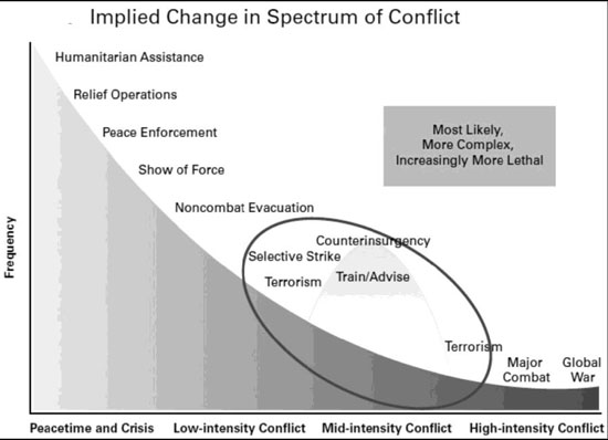 Как видно сложные, "гибридные" войны и конфликты стали наиболее реальными угрозами и частыми войнами и конфликтами в XXI веке. При этом именно "гибридные" войны стали наиболее часто используемыми средствами США и Запада в целом, хотя именно для оправдания этого продвигается идея о их происхождении из других источников: "... гибридные угрозы, особенно со стороны таких государств, как Китай, Россия, Иран и Северная Корея, представляют наибольший операционный риск, который отражен на рисунке, в связи с более высокой интенсивностью конфликта и большей частотой возникновения. Этот пункт изображен в качестве "отправной точки" в кривой изменения спектра конфликтов, миссии и задачи которых сходятся во времени и не выполняются в линейном порядке"[5].