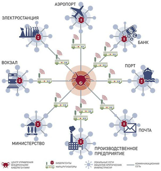 Наконец, огромное значение в формировании СО приобретают специальные кибероперации и атаки, в частности, с помощью специально подготовленных заранее объектов. Так, член ВПК РФ по АСУ Игорь Шеремет, иллюстрирует эту мысль следующим образом[9].