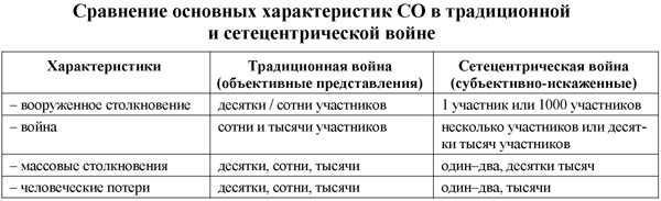 И с этой характеристикой современной СО совершенно нельзя согласиться по причине того, что субъективно-искаженные представления о СО, ставшие нормой для сетецентрической войны, совершенно по-иному отражают существующие реальности. Эту разницу можно представить в следующем сравнении.