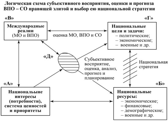 Целеполагание и стратегическое планирование, как процессы подготовки и принятии политических решений, влияющих на формирование ВПО и СО, находятся под сильным воздействием субъективных факторов. Прежде всего способности и готовности правящей элиты адекватно воспринимать, оценивать и прогнозировать развитие МО, ВПО и СО. К сожалению, далеко не всегда правящая элита принимает своевременные и адекватные решения, отражающие реальные интересы нации и государства и соответствующие их системе ценностей. Степень этой адекватности может быть очень разной, но, наверное, она будет сильно колебаться в зависимости от профессионализма, патриотичности, креативности и других качеств правящей элиты. В любом случае объективные интересы (потребности) нации и общества проходят через "призму" осознания элитой и трансформируются в цели и задачи стратегии, с одной стороны, и распределение национальных ресурсов, с другой. На известном рисунке это будет выглядеть следующим образом применительно к оценке и прогнозу развития ВПО - Со и, главное, - выбору национальной стратегии.