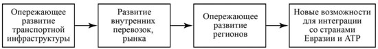 В евразийской стратегии России изначально принципиально важно политически сформулировать существующую взаимосвязь между политикой евразийской интеграции, опережающим развитием восточных регионов России и еще более быстрыми темпами развития транспортной инфраструктуры. Схематично эта взаимосвязь выражается в следующей последовательности.