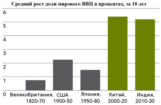 На схеме ниже показано, что Великобритании понадобилось 155 лет, чтобы удвоить свой подушевой ВВП при населении приблизительно 9 миллионов человек в 1870 году... США и Германия потратили на это от 30 до 60 лет при населении в несколько десятков миллионов человек. Индия и Китай подходят к этому уровню темпами, каких никогда не наблюдалось: в 100 раз больше жителей, чем в Великобритании и в десять раз меньше времени. К 2030 Азия при таких темпах развития может стать мировым центром влияния, как это уже было до 1500 года.