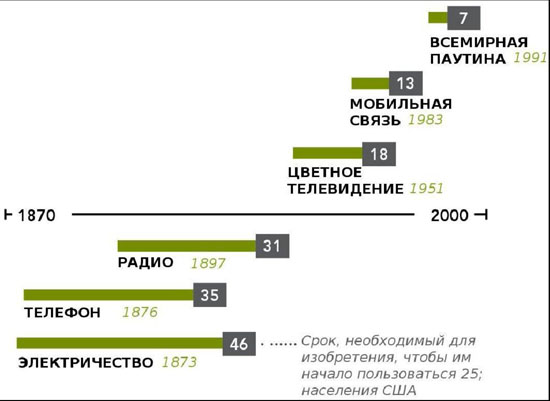 Освоение новых технологий американцами будет происходить еще быстрее. Скорость освоения в развивающихся странах также увеличится, позволяя этим государствам перепрыгивать через этапы развития, которые в свое время пришлось пройти развитым странам[5].