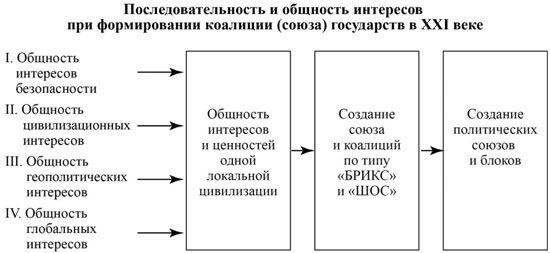 Формирование новых мировых центров силы неизбежно ведет к созданию новых политических, экономических и военных союзов и коалиций во главе с новыми цивилизационными лидерами. При этом было бы глубоким заблуждением думать, что в основе этих союзов будут лежать только экономические интересы или выгода, как нередко говорится сегодня. Эта схожесть, даже общность интересов будет предполагать прежде всего общность интересов безопасности, цивилизационную общность (систем ценностей) и геополитическую общность, что можно продемонстрировать на следующем рисунке.