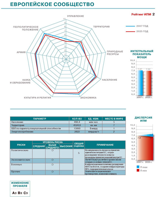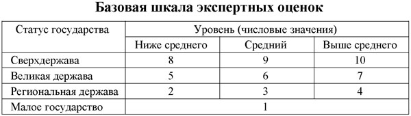 В расчетах подразумевается, что оценка "высокое" соответствует развитию оцениваемого фактора на уровне "сверхдержавы", "выше среднего" - "великой державы", "среднее" - "региональной державы" и "ниже среднего" - "великой державы" соответственно.