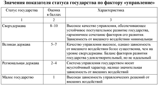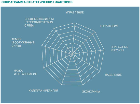 Исследованиями, проведенными в отношении исторической динамики и прогноза развития по более чем 50 странам, выявлено, что одни факторы обнаруживают сравнительно меньшую, другие - сравнительно большую амплитуду изменений. К первым относятся территория, природные ресурсы, население, ко вторым - внешняя политика и синтезирующий все эти элементы фактор управления, который находится в зависимости от качества лидерства и эффективности системы государственного управления и ее координированности с корпоративным и общественным управлением.