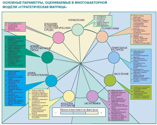 Оценка статуса и прогнозной динамики процесса государственного развития осуществляется в модели стратегической матрицы по девяти базовым факторам.