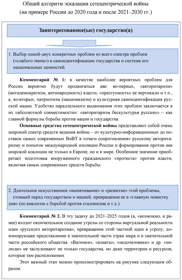 Можно достаточно определенно прогнозировать каким образом до и после 2021-2025 годов будет развиваться сетецентрическая война против России со стороны западной ЛЧЦ по отдельным этапам, часть которых уже пройдена. Ее рабочий алгоритм фактически уже существует последние десятилетия. Более того совершенствуется не только в секретных документах, но и открытых для общественности нормативных и иных актах[3]. Поэтому логические рассуждения о нем и действующую схему можно комментировать следующими конкретными примерами для наиболее важных этапов развития сетецентрической войны. Естественно, что эта схема не абсолютно выверенный алгоритм, а, скорее, логический порядок развития сетецентрической войны по отдельным этапам. В реальной схеме могут присутствовать и различные новые этапы и отсутствовать, быть "пропущенными" некоторые из указанных здесь.