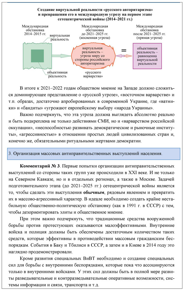 После 2021 года вероятность того, что развитие сценария МО и СО в военную стадию масштабного конфликта России с западной локальной человеческой цивилизацией (ЛЧЦ) будет очень высока. Надо исходить из того, что современный сценарий развития МО-ВПО-СО означает только начальную стадию сетецентрической войны против России, которая в конечном счете характеризуется: