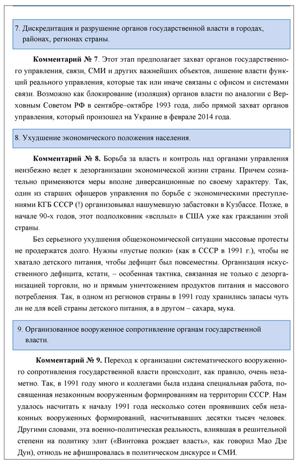 Некоторые военные эксперты, например, выделяют следующие приемы демонтажа государства, хотя этот перечень очень приблизителен, а нужен научно обоснованный и проработанный конкретно перечень всех возможных средств.
