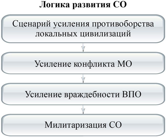 XXI век характеризуется (и достаточно категорично) усилением межцивилизационного противоборства и соответственно увеличением числа негативных сценариев развития МО и вытекающих из них многочисленных негативных сценариев развития ВПО, отражающим следующую логику: