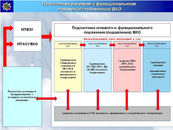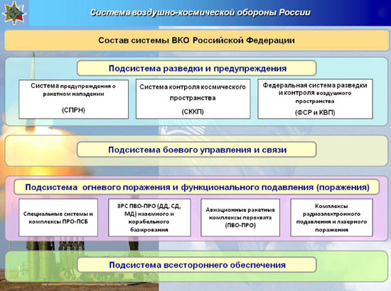 В XXI веке наиболее актуальной угрозой в Евразии стала угроза воздушно-космического нападения, возможные сценарии которой были уже апробированы США в Ираке и Ливии. Наземные операции в Афганистане, Ираке, других странах, показали свою неэффективность, даже вредность. Понятно, что единственным реальным средством противодействия воздушно-космическому нападению становятся средства ВКО. Они же, будучи оформлены в адекватную военную доктрину, могут стать и главным инструментом военно-политической интеграции в Евразии, т.е. помочь реализовать сценарий военно-политической интеграции в Евразии. Это может быть тот редкий случай, когда внешне выглядевшие военно-технические решения становились влиятельными средствами политики. Решение этой задачи однако под силу лишь нескольким государствам, либо коалициям. Система ВКО предполагает, в частности, разработку, создание, развертывание и эксплуатацию следующих основных подсистем, которые показаны на рисунке.