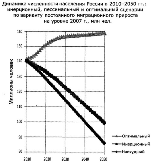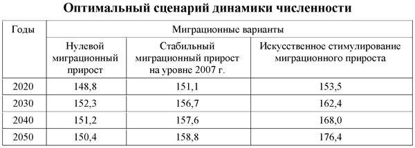 Налицо, как мы видим, - понятный сценарий развития и стратегический прогноз: в оптимальном сценарии (т.е. при сочетании создания высокоразвитой системы здравоохранения, внедрения адекватной антита-бачной, антиалкогольной политики и эффективных мер поддержки рож-даемости) задача предотвращения депопуляции России решается даже при сохранении миграционного прироста на уровне 2007 г. (т.е. без его искусственного стимулирования.