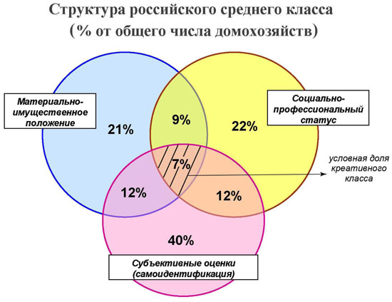 Как видно из рисунка, средний класс составляет порядка 20%, а креативный - 7% российских граждан[11]. Соответственно, чтобы изменить положение России в мире не только политически, экономически, цивилизационно и с военной точки зрения необходимо, чтобы средний класс вырос в разы, как минимум, в 3-3,5 раза, а креативный класс - удвоился, достигнув 14-15% (хотя я согласен с некоторыми западными оценками в том, что российский креативный класс может достигать 30-35%)[12]. О том, какое значение имеет это показатель и другие социальные показатели на будущие сценарии развития МО свидетельствует, например, доклад, подготовленный для Всемирного экономического форума в Давосе, посвященный сценариям развития Украины. В этом докладе, в частности, говорилось об "огромных возможностях для Украины", вытекающих, во-первых, из перспектив роста среднего класса, а, во-вторых, растущих потребностях в пищевых продуктах[13].