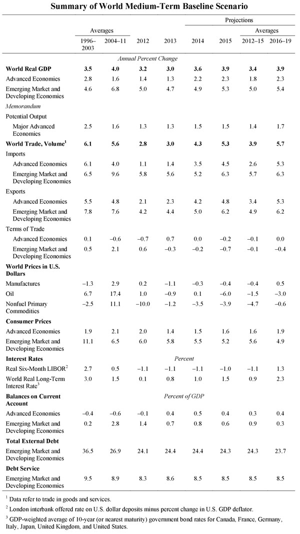 Регулярно публикуются и прогнозы (кратко-, средне- и долгосрочные) социального и экономического развития. В том числе и в соответствии с различными сценариями. Так, например, МВФ регулярно дает анализ и прогноз развития мировой экономики, в том числе и по основным сценариям. В качестве примера можно привести среднесрочный прогноз по основным сценариям, подготовленный весной 2014 года[19].
