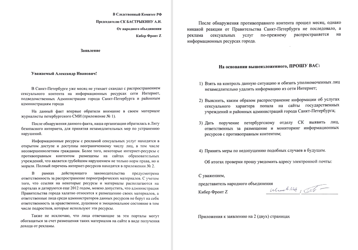 Представители движения «Кибер Фронт Z» обратились к председателю Следственного комитета РФ Александру Бастрыкину с просьбой разобраться в ситуации с размещением запрещенного контента на сайтах, подведомственных правительству Санкт-Петербурга.