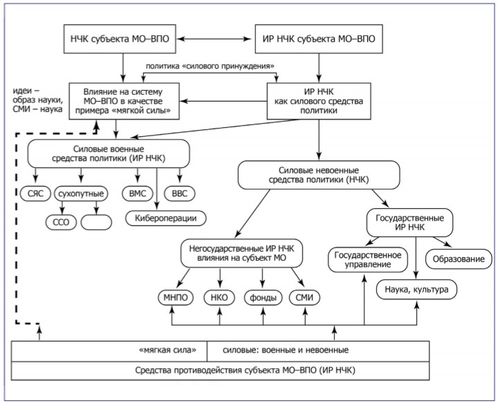 Как видно из рис. 2, существуют два наиболее общих комплекса внешнеполитического влияния, которые относятся в целом к категории политики силового принуждения: в явной, открытой силовой форме (вооружённого и невооружённого насилия) и в форме «агитационной», получившей название «мягкой силы»[5]. Им соответствуют ИР НЧК субъекта МО–ВПО.