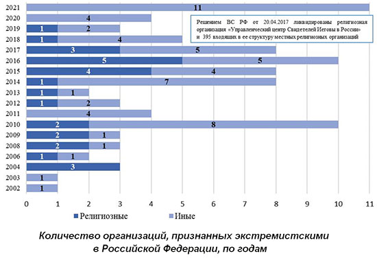 Более того, в СНБ уделяется крайне мало места развитию институтов человеческого капитала – государственных и не государственных, а также созданию институтов противодействия таким враждебным зарубежным институтам. В ходе развития сценария военно-силового противоборства с Западом, в особенности в его наиболее острой фазе, когда против России было организовано массированное применение всех институтов – государственных и не государственных – развития человеческого капитала от СМИ до спортивных обществ и клубов любителей кошек, Россия не всегда могла противопоставить эффективный ответ, а также с опозданием стала реагировать на деятельность даже откровенных институтов. Представление об этом дают следующие данные. Отметим, что на 01.06.2022 в перечне, который ведет Министерство юстиции Российской Федерации, находилось 90 экстремистских организаций, что явно не много и не идет ни в какое сравнение с периодом конца 90-х – начала 2000-х гг., когда деятельность таких организаций фактически не ограничивалась.