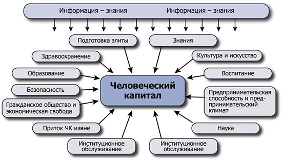 Сам же человеческий капитал определяет в современной экономике основную долю национального богатства стран, регионов, муниципальных образований и организаций. В то же время доля неквалифицированного труда в ВВП развитых и развивающихся стран, включая Россию, становится всё меньше, а в технологически передовых странах она уже исчезающе мала. К сожалению, именно этот главный показатель не является основным при оценке деятельности институтов государства, которое по ИРЧП стабильно занимает место в восьмом десятке государств мира.