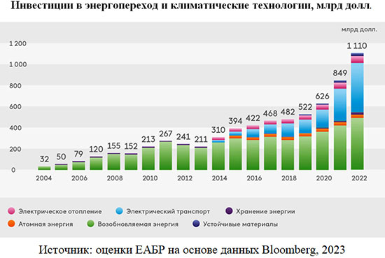 Примером этому может послужить решение проблемы экологической безопасности, которая является глобальной, с одной стороны, и национальной, с другой. Реализация зеленых проектов, внедрение экологически чистых технологий, цифровых решений, направленных на декарбонизацию и охрану окружающей среды, – капиталоемкие процессы. Согласно некоторым оценкам, стоимость достижения углеродной нейтральности составляет от 10 млрд до 6,5 трлн долл. в отдельных странах региона[2]. Несмотря на то, что в 2022 г. инвестиции в глобальный энергопереход превысили 1 трлн долл. и впервые сравнялись с затратами на производство ископаемого топлива, глобальный переход к низкоуглеродной экономике требует еще большего объема инвестиций – не менее 4–6 трлн долл. в год по оценкам ООН[3].